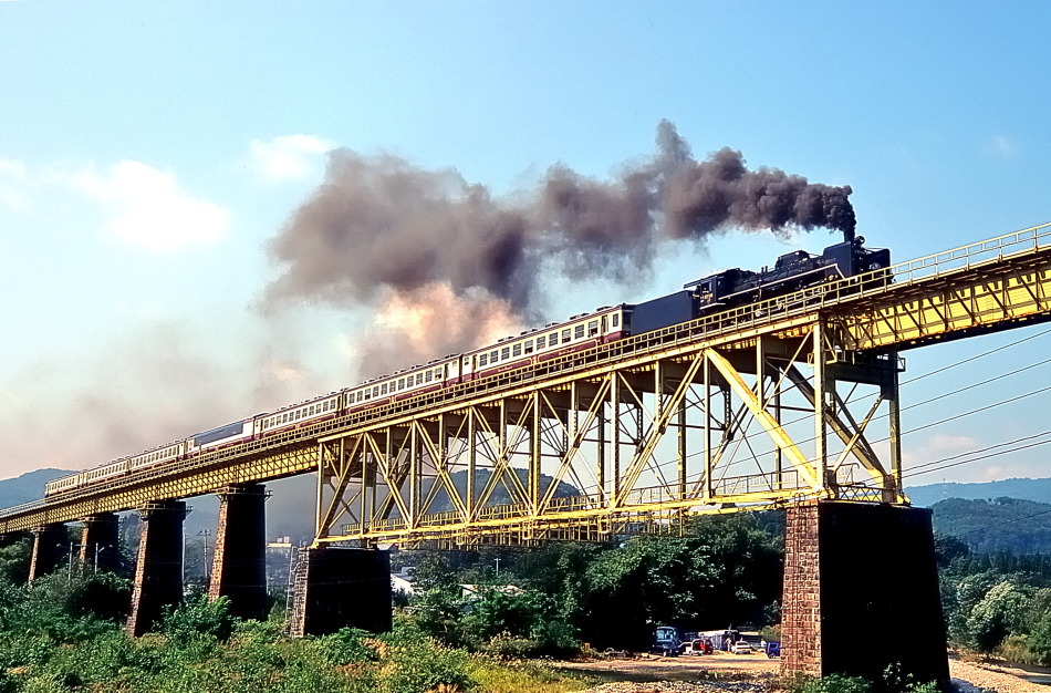 一ノ戸橋梁を煙を吐いて渡るC57180の写真をようやく撮ることができました。583系白虎や国鉄色485系「あいづ」などの”ついで”がないと,なかなかここまで来れない。 (2007/07/07再スキャン 2022/10/30ワイド化) |