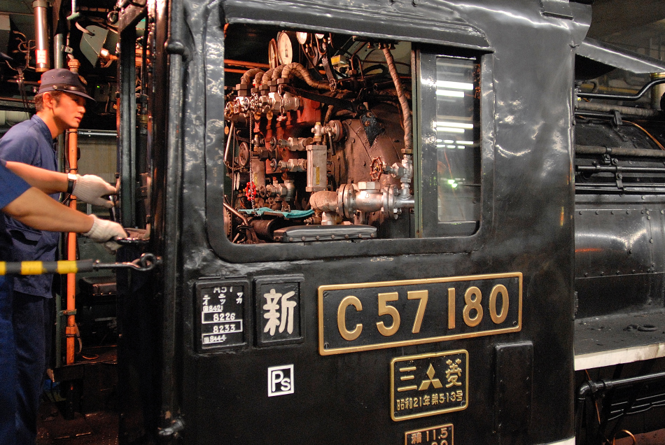 新潟に到着した「SLばんえつ物語号」,白熱灯に照らされたC57180のキャブ内。 (2022/10/30追加) |