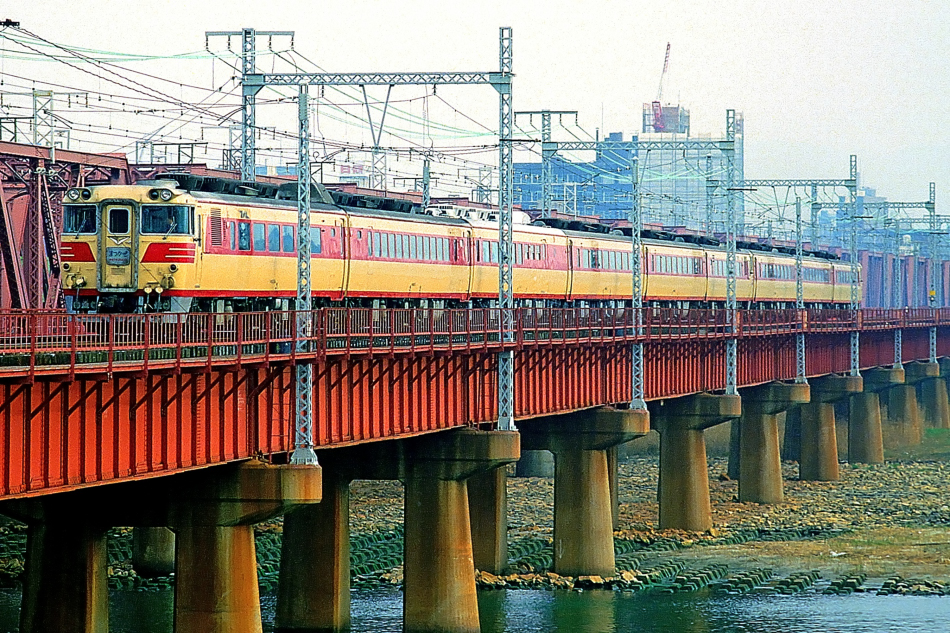新淀川の鉄橋を渡る「まつかぜ」。3両目のキシ80の屋根がピカピカ。編成は6+3連。135mmでの撮影。 (2007/06/19再スキャン 2022/07/02ワイド化) |