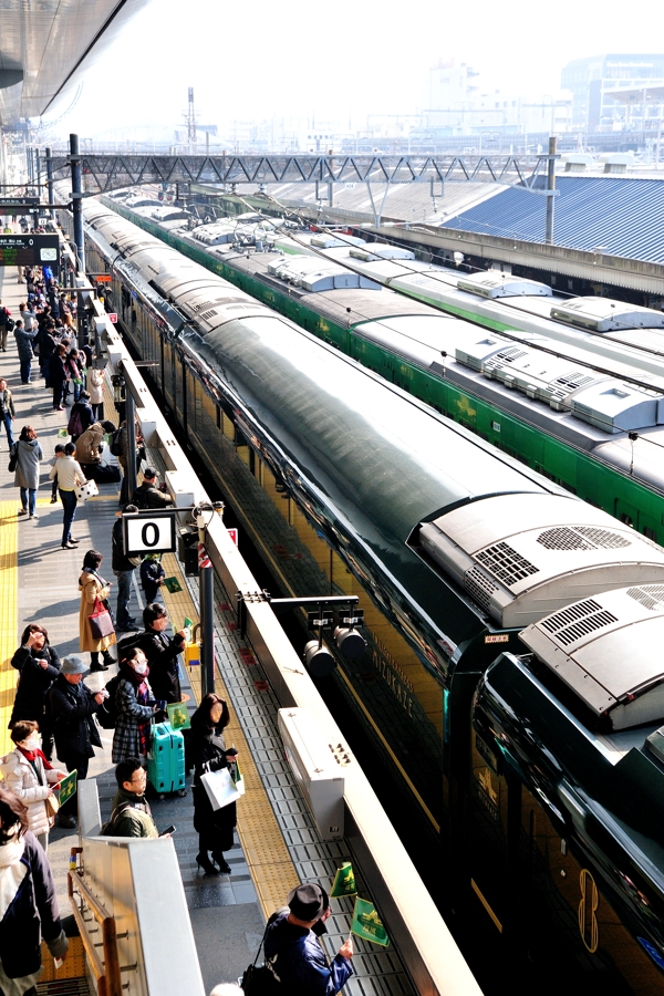 | No.D700_180224‐058 2018年2月24日 87系 瑞風 キサイネ86‐501他 10両 東海道本線 京都 0番のりばでは小旗を持ったお見送りのお客さんが多数,賑わっています。1番には117系が入っています。この位置からみると,車体は24系寝台客車に良く似ており,電車,気動車,客車の技術をうまく融合させていると感じます。 |