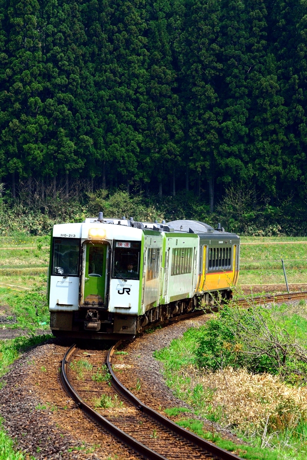 キハ110+キハ111+キハ112 回転リクライニングシートを備えた0番台車3両編成で田園地帯をゆく急行「陸中」 |