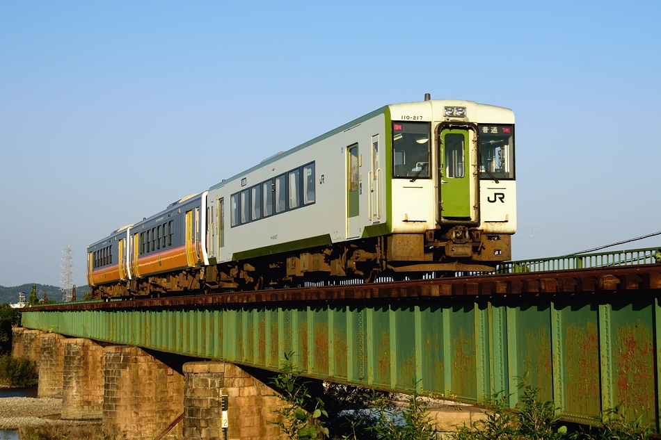 キハE120と混結編成で新津に向かうキハ110‐217。 (2018/09/29追加) |