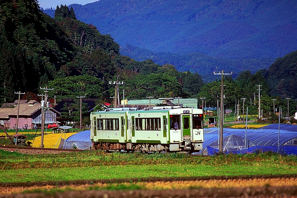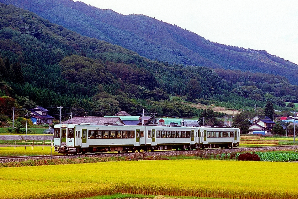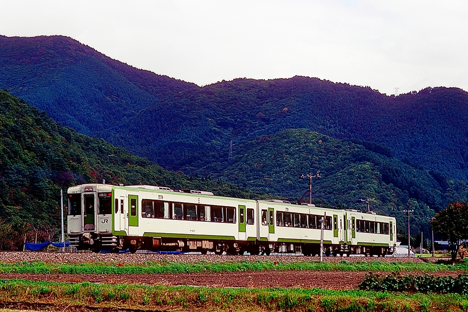 喜多方へのストレートを行く3両編成の普通。キハE120+キハ110x2。 | ||||||||||||||||||||||||||||||||||||||||||||||||||||||||||||||||||||||||||||||||||||||||||||||||||||||||||||||||||||||||||||||||||||||||