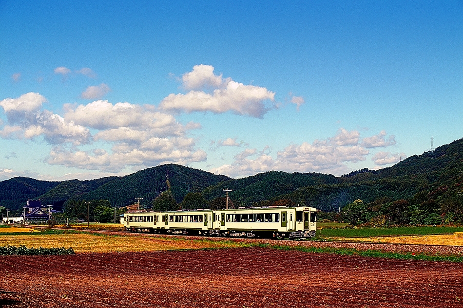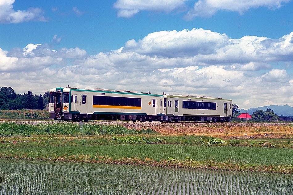 田園地帯をゆく陸羽西線のキハ110 200番台車2両編成 | ||||||||||||||||||||||||||||||||||||||||||||||||||||||||||||||||||||||||||||||||||||||||||||||||||||||||||||||||||||||||||||||||||||||||