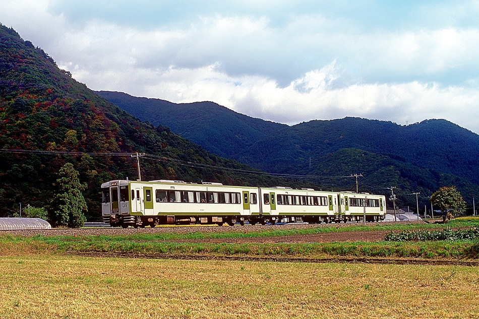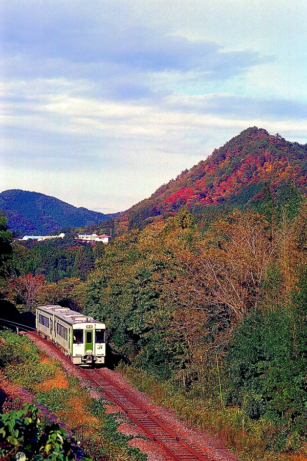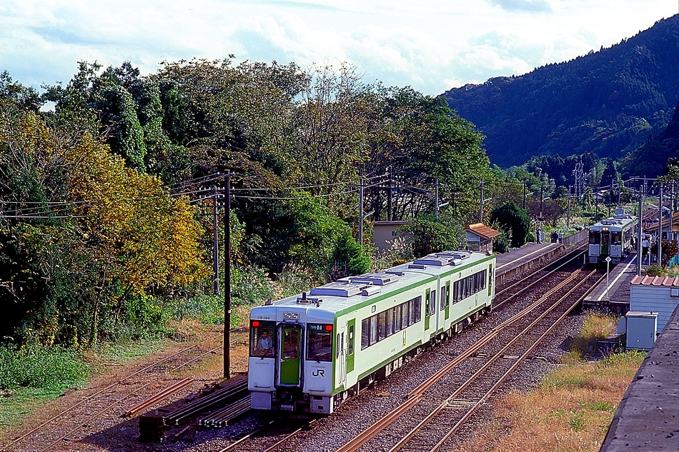| No.285‐32 1992年11月1日 キハ111‐120他 2両 普通 水戸行 水郡線 西金→下小川 水戸 キハ111‐120+キハ112‐120 常陸大子 奥久慈の秋を背景に快走するキハ111+キハ112の編成。 (2019/01/14追加) |