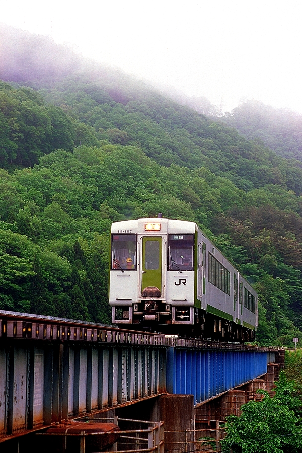 | No.431‐17 2004年5月22日 キハ111‐107他 2両 普通 磐越東線 夏井←川前 キハ111‐107+キハ112‐107 C11を撮りに行った時の写真。F4s最末期,調子が悪く連写できませんでした。 |