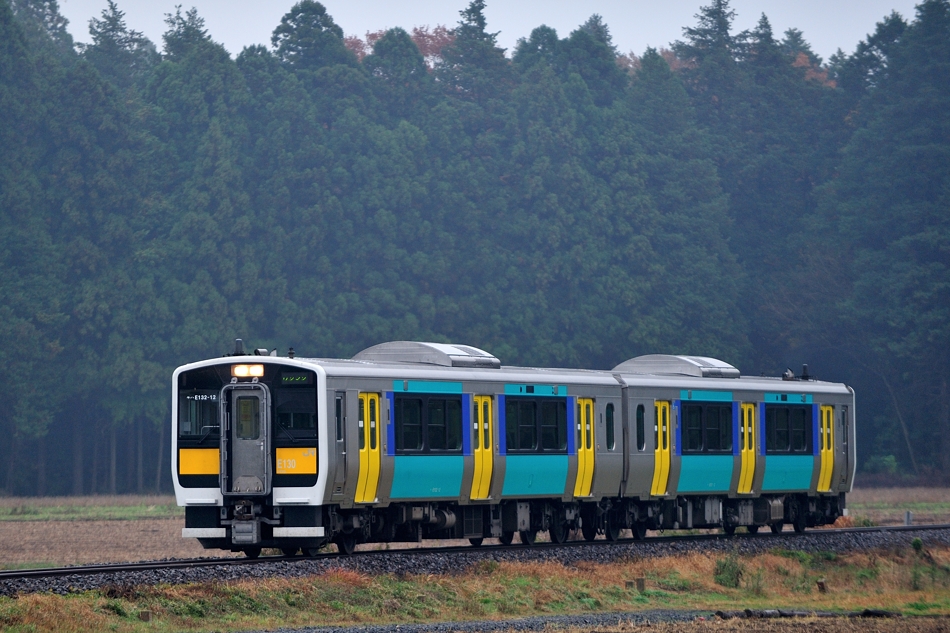 水戸 キハE131‐12+キハE132‐12 郡山 雨の水郡線をゆく2両編成。 |