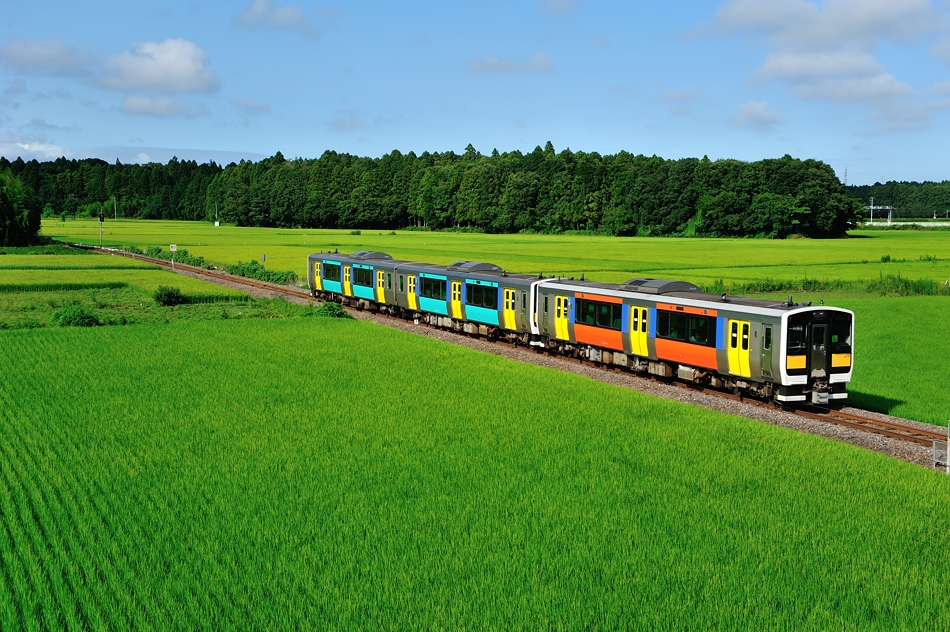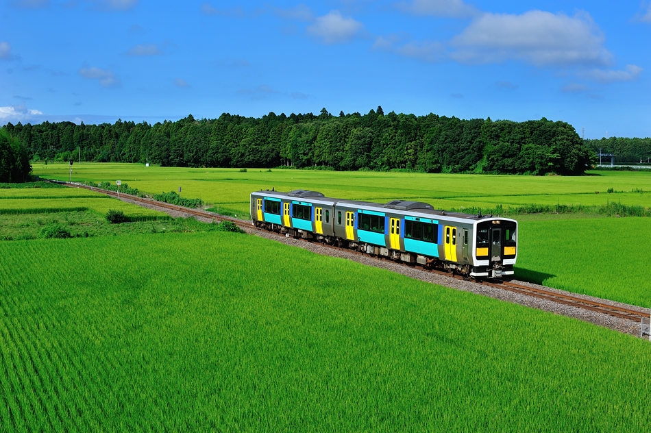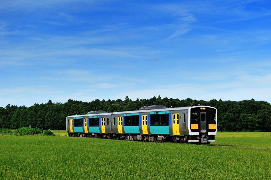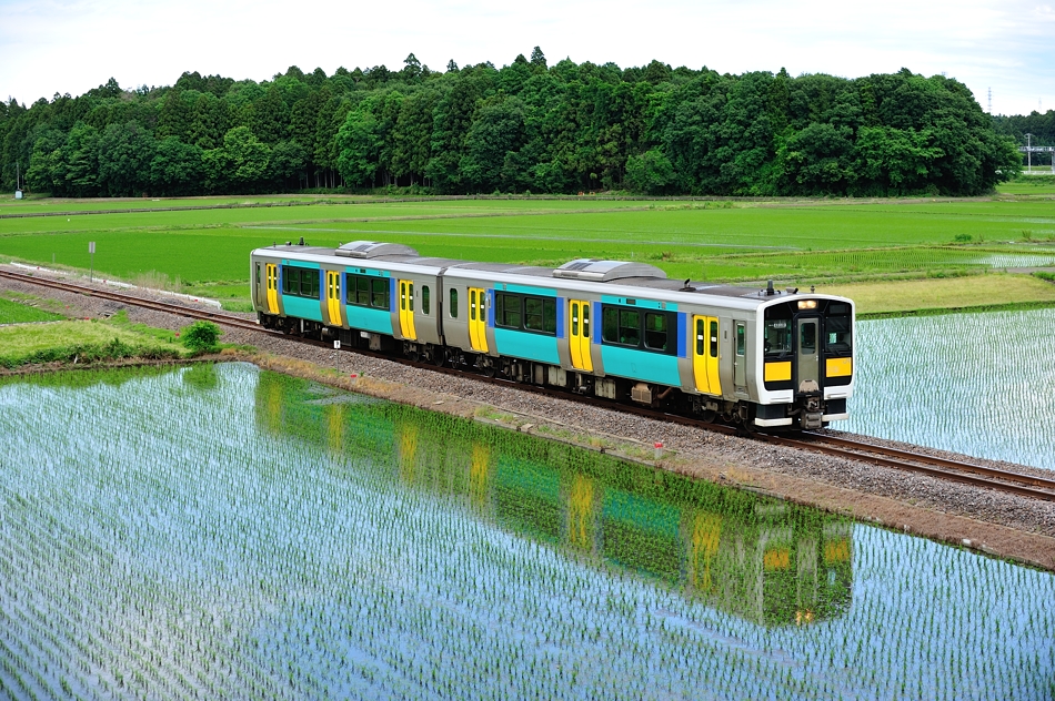 水戸 キハE131‐1+キハE132‐1 郡山 田園地帯を快走するキハE130系2両編成。 |
