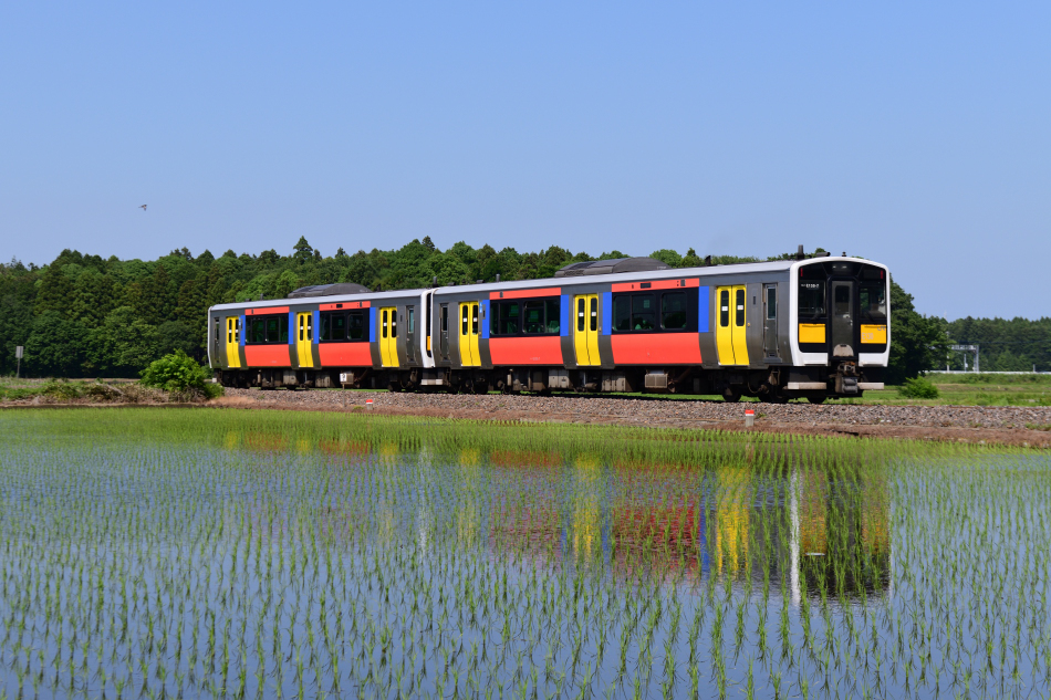 水戸 キハE131‐3+キハE132‐3 郡山 田植え後の水鏡に映るキハE131 |