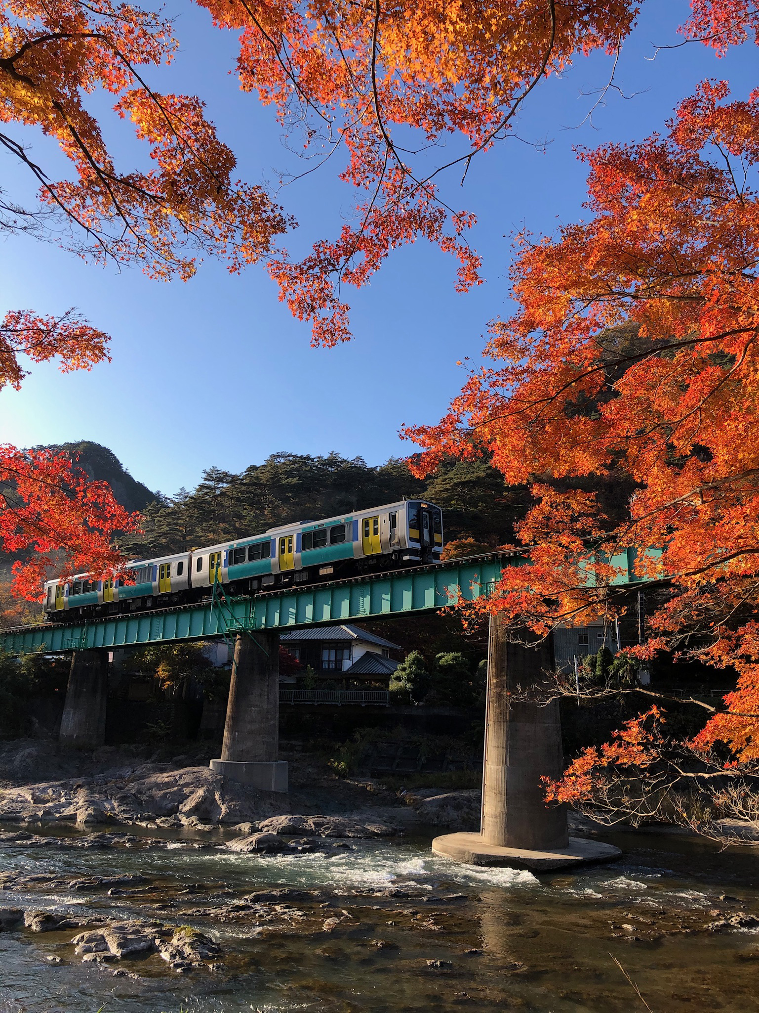 | No.IP2020‐1114‐001 2020年11月14日 キハE132 0番台他 2両 普通 水郡線 矢祭山→東館 水戸 キハE131+キハE132 郡山 同行した家人のスマホ一発撮り。迷いましたが縦位置の方が良かったかも。 (2020/11/22追加) |