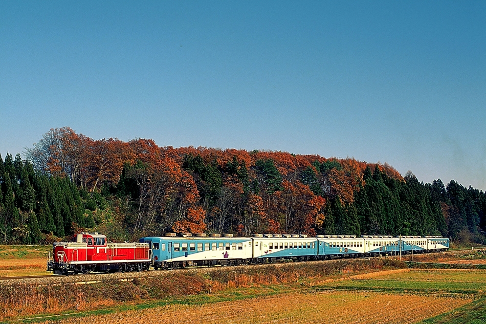 ハデな塗色のオク座とDE10のコントラストが晩秋の磐越西線に映えていました。 (2006/10/09再スキャン) |