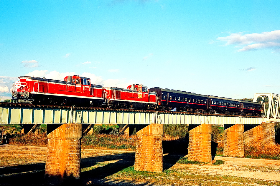 久々にゆとりを撮りました。DE10牽引なんて初めてと思います。客車列車が貴重になる中,非常に美しい走行シーンを目にしてうれしく思いました。 (2006/10/14再スキャン) |