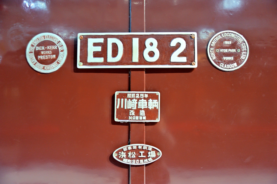 側面のナンバープレートです。 左:DICK‐KERR WORKS PRESTON THE ENGLISH ELECTRIC Co.,Ltd., QUEENS HOUSE KINGSWAY , LONDON 右:1923 HYDE PARK WORKS NORTH BRITISH LOCOMOTIVE COY. LTD. GLASGOW 中:昭和25年 川崎車輌 改造 NO■6■ 下:日本国有鉄道 浜松工場 昭和30年改造 (2012/05/04追加 2022/12/11ワイド化) |