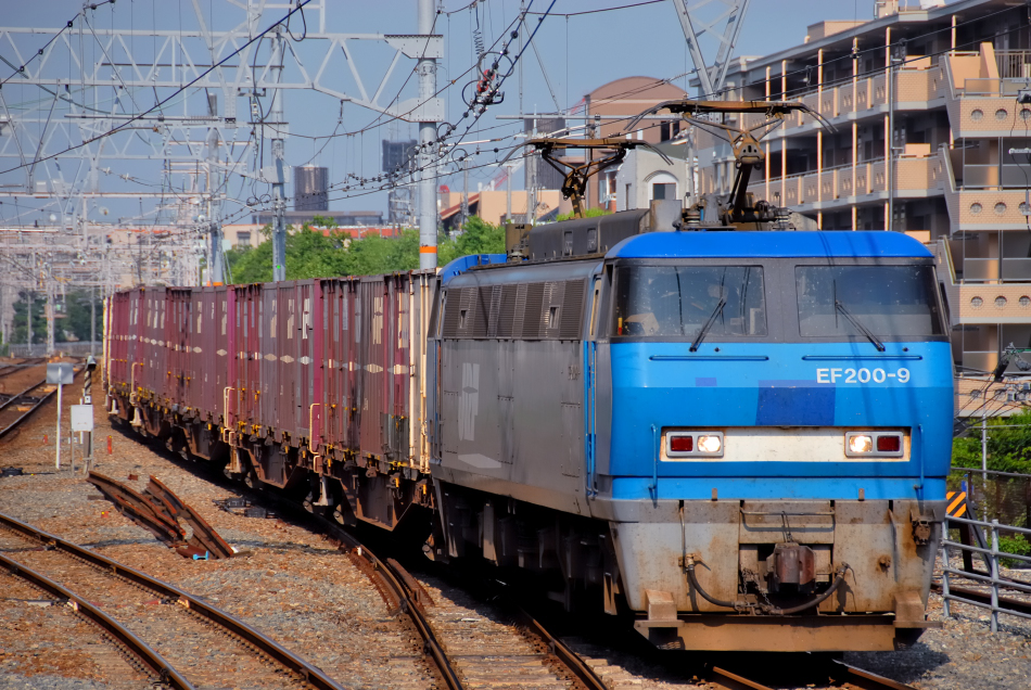 | No.D200_110810‐11 2011年8月10日 15:48 EF200 9[吹]+コキ 東海道本線 芦屋 |