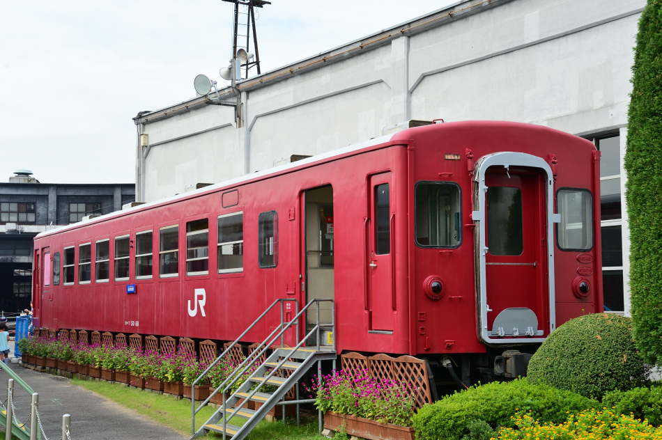 休憩室として梅小路の扇形機関庫の脇に留置されているオハフ50。オハフ50形は前位側を業務用室,後位側(写真手前)を専務車掌室とし,トイレを装備しています。乗務員用扉が両エンドにあるのが特徴。 (2022/10/09追加) |