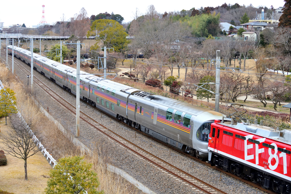 EF81 95号機に牽引されるE26系カシオペア編成。下り列車ではカハフE26が機関車の次位になるため前面展望は塞がれますがEF81の車体越しに斜め前の視界を楽しめそうです。一方,ハイデッカーのラウンジ部の側窓も広く,ゆったりした眺望が旅行気分を上げてくれますね。 | ||||||||||||||||||||||||||||||||||||||||||||||||||||