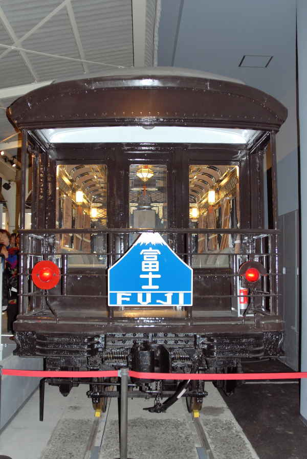 展望車のデッキに取り付けられた行灯式テールマーク。丸い「つばめ」「はと」の他,山型の富士マークもありました。富士のローマ字はHUZIと表記されています。ちなみに鉄道博物館のマイテ3911の富士はFUJIとなっています。 (2023/01/05追加 2026/01/07ワイド化) |