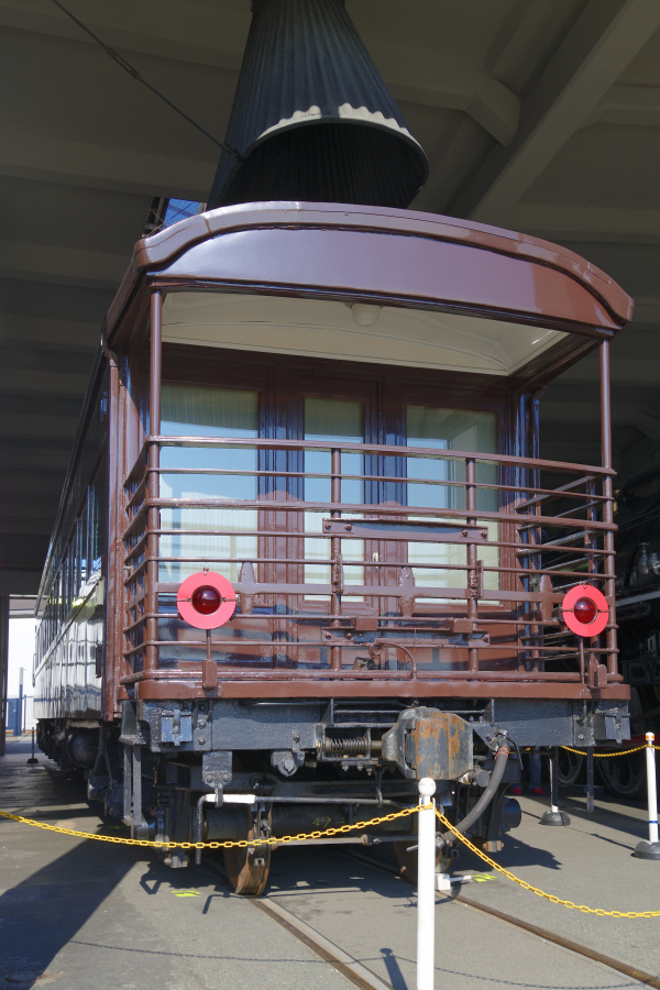 1947年に冷房化改造した際,写真手前側にあたる後位側の片デッキ (4位側) を塞いで冷房配電盤室としています。その後,皇太子の非公式用として整備した際に再び緩急車化しており,塞いだデッキの横に車掌室扉が設けられていて特殊な構造になっています。 (2023/1/3追加) |