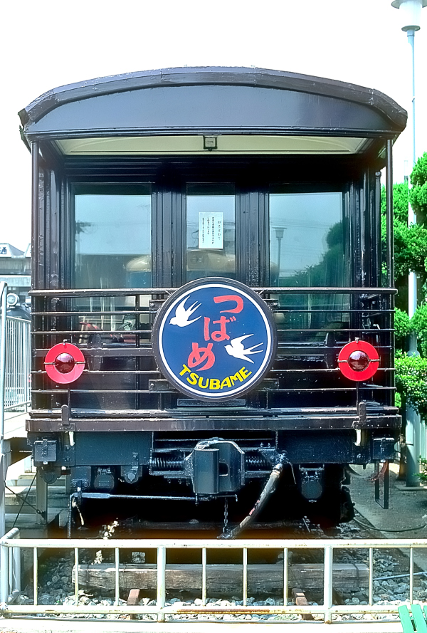 | No.8-35 1983年8月4日 マイテ49 2 [スハ32系客車] 交通科学館 「つばめ」テールマークを付けて交通科学館に展示されていた頃のマイテ49 2。マイテ49 2は特急「富士」用スイテ37000形・スイテ37010形の置換えとしてスイテ37040形,スイテ37041として1938年に大井工場で製造されました。丸屋根,3軸ボギー台車TR73を履き,UF50A台枠を使用した溶接組み立ての鋼体,展望室の側窓は1200mm幅,その他は700mm幅,展望室と一等室の間にはボックスシート8名分を設置,車軸駆動冷房装置の搭載準備がなされています。1941年10月の称号改正でスイテ49 2となりましたが,戦時中は使用停止,戦後は進駐軍に接収され,冷房が装備されました。1949年に接収解除となり,照明の蛍光灯化,冷房改造などを施工して整備し特急「はと」に使用されました。1953年の称号改正でマイテ49 2と改称しています。1956年に青大将色に塗り替えられ,1957年には宮原区に転属し「つばめ」の予備車となりました。1960年にマロテ49 2に改称,1961年に廃車となり,大阪の交通科学館に保存されていました。 (2022/10/06ワイド化) |