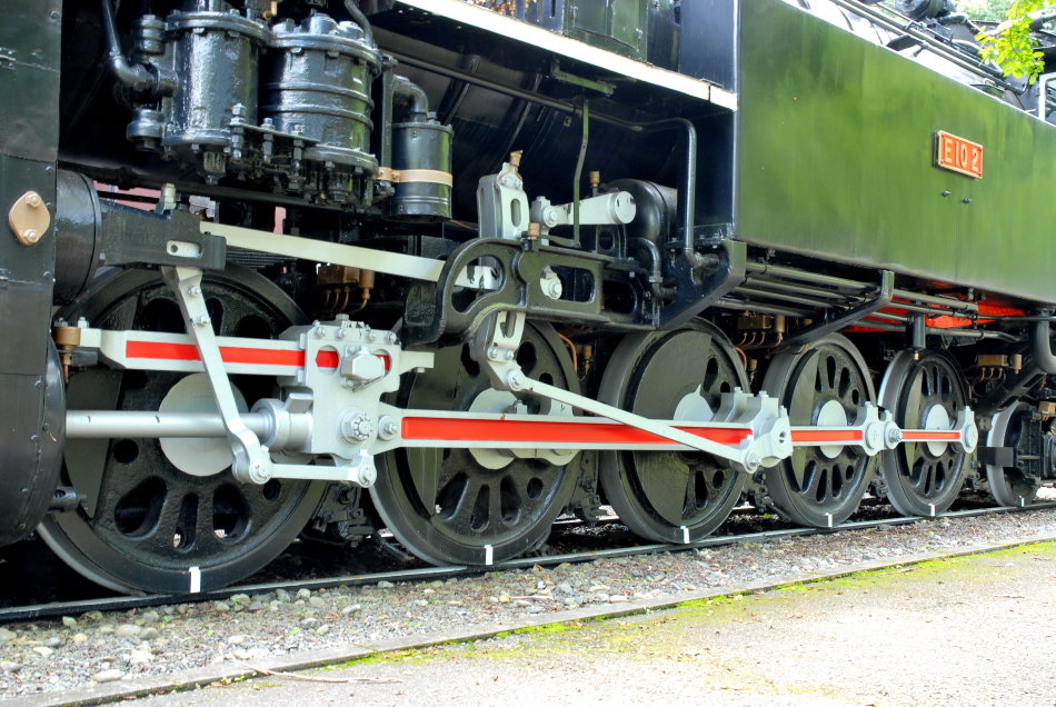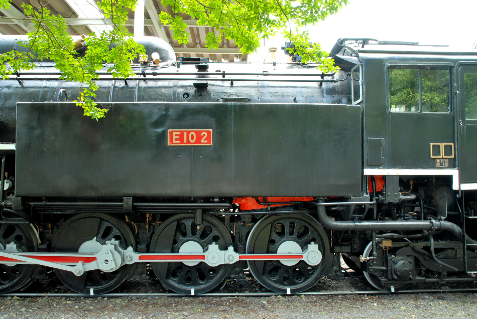 | No.D200_110824-80 2011年8月24日 E10 2 青梅鉄道公園 線路のカーブに対応するため,E10形では5つの動輪のうち第3,第4動輪はフランジレス車輪となっています。 (2022/12/14追加) |