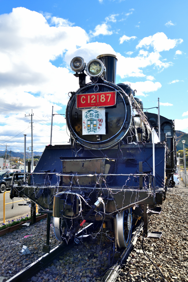 | No.D850_241123-083 2024年11月23日 C12 187 水郡線 常陸大子 イルミネーションのLED配線や水郡線90周年と書かれた紙が貼り付けられているのが残念。 (2024/12/12追加) |