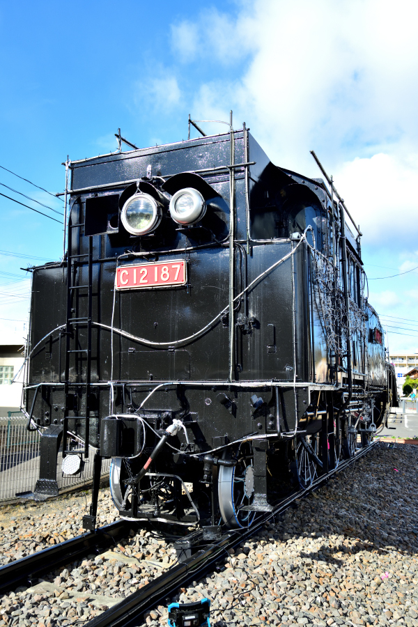 常陸大子駅前に静態保存されているC12 187。この機関車は1938年7月27日に日本車輌名古屋工場で新製され,門司鉄道管理局・東唐津機関区に配置されました。その後,豊後森機関区,宮崎機関区杉安駐泊所,宮崎機関区,鹿児島機関区と異動し,1976年7月6日に水戸機関区へ転入,入換専用機として活躍しました。1970年5月31日に高崎第一機関区に移り9月3日に足尾線足尾‐桐生間でエキスポ団臨客レを牽引しています。同年11月28日に廃車となりました。 (2024/12/12追加) |