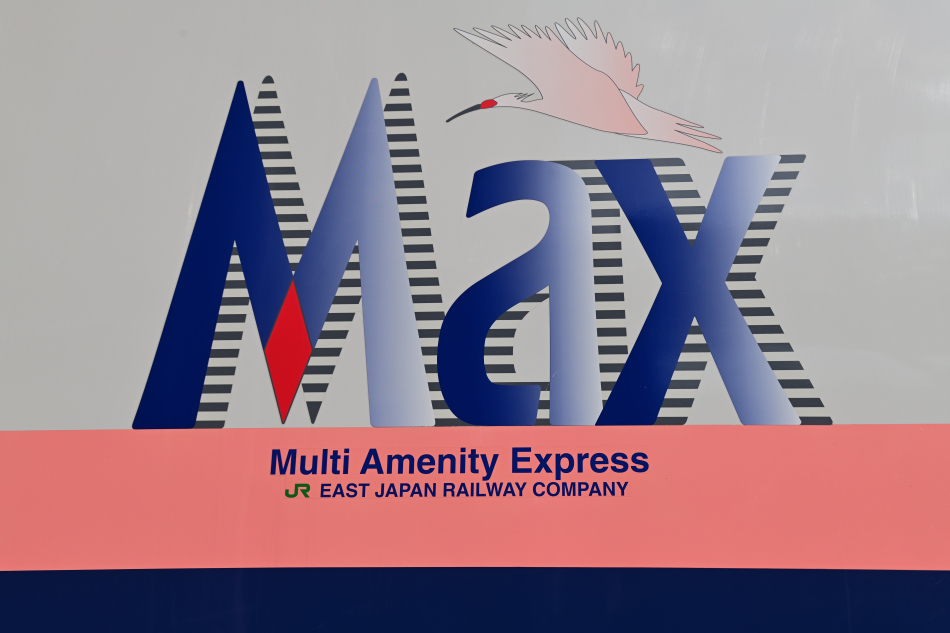 2号車寄りの外板にはMaxのロゴマークと朱鷺の飛翔図が描かれています。 |