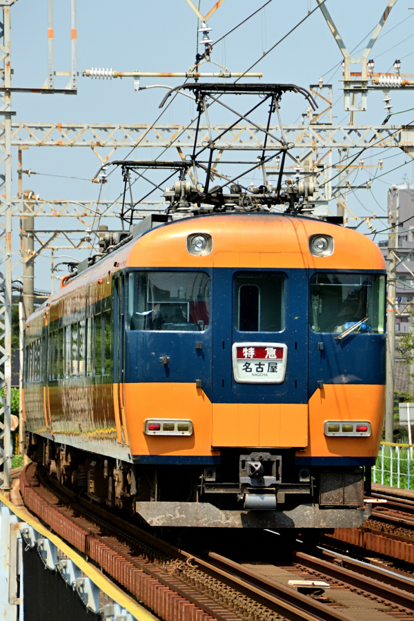 大阪難波 モ22100‐モ22400+モ12200‐サ12120‐モ12020‐ク12300 近鉄名古屋 海蔵川橋梁を渡る大阪難波行き名阪乙特急。スズメバチのような印象の22000系,2両固定編成のモ22100はダブルパンタグラフ装備となっています。 (2024/04/02ワイド化) |