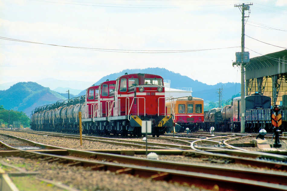 小坂構内でキハ2107と並ぶDD13の3重連タンク列車。先頭はDD131。DD131〜3の3両は重連総括制御を搭載しており3重連も容易。 | ||||||||||||||||||||||||