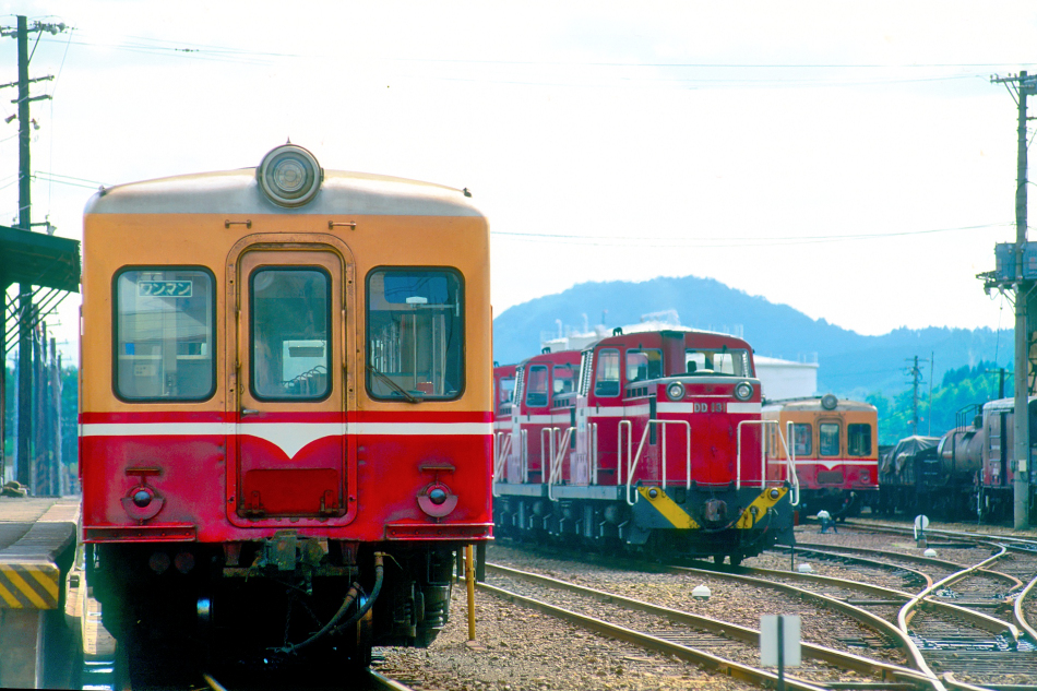 小坂駅構内。左からキハ2106,DD13の三重連貨物,右がキハ2107です。左は写真No.315-33からキハ2106と判明,右はワンマン化されていて大館方にコネクタがないのでキハ2107と判りました。 | |||||||||||||||||||||||||||