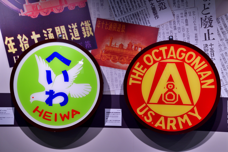 接収されていた当時,10号御料車のデッキに掲げられていたOCTAGONIANのテールマーク。左は戦後復興最初の特急となったへいわのヘッドマーク,双方とも複製とのことです。 (2026/01/07追加) |