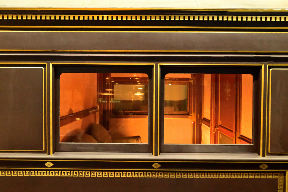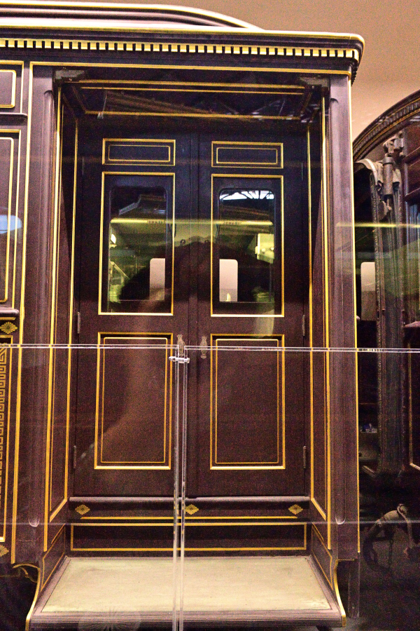 | No.D850_221112-257 2022年11月12日 7号御料車 鉄道博物館 前位側出入台付近。扉,窓周り,屋根に至るまで金線による装飾が随所に施されています。 |