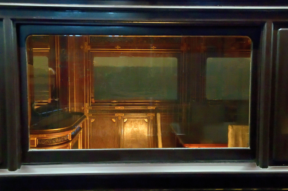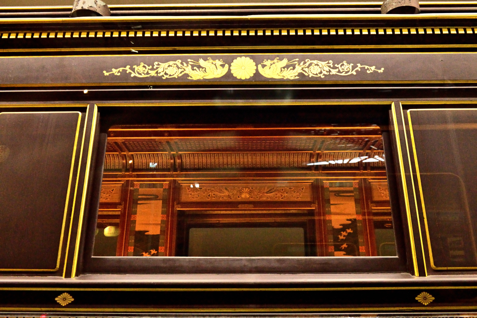 | No.D850_221112-305 2022年11月12日 1号御料車[初代] 鉄道博物館 明治初期の美術工芸の粋を凝らした内装が垣間見えます。車内には三種の神器のうち草薙剣(くさなぎのつるぎ)と八尺瓊勾玉(やさかにのまがたま)を安置する剣璽棚が設置されています。 |