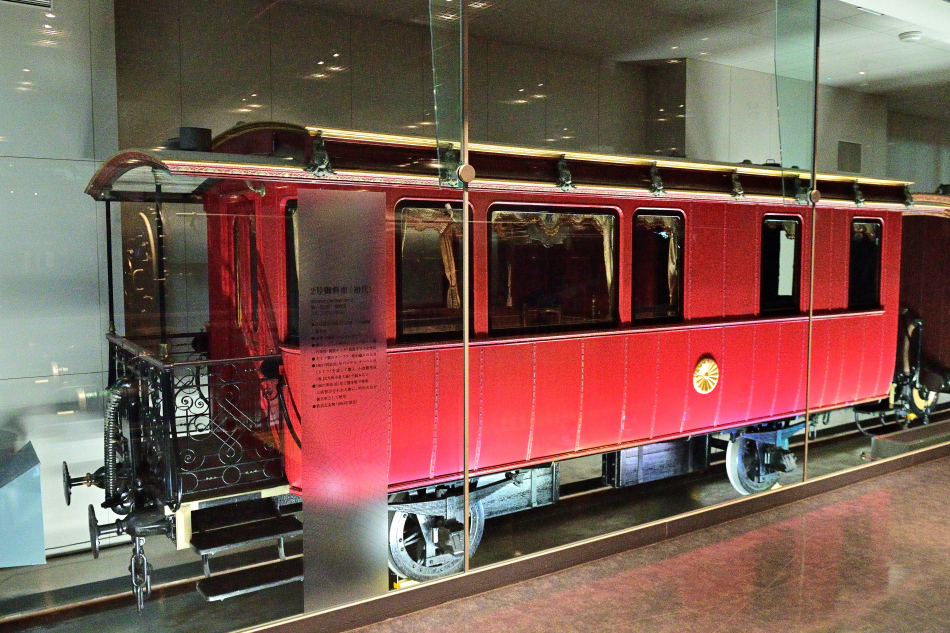 2号御料車は1902年(明治35年)の)陸軍軍事演習に行幸される明治天皇の御乗用として九州鉄道が勢作した車両で,全長8.19m,幅2.54mの,木造2軸車となっています。御料車の前後に開放式出入台を設置しており,外板は短冊張りで下部がすぼまった形状をしています。1963年に鉄道記念物に指定されました。 | ||||||||||||||||||||||||||||||||||||||||||||||||||||||||||||||||||||||||||||||||||||||||||||||||