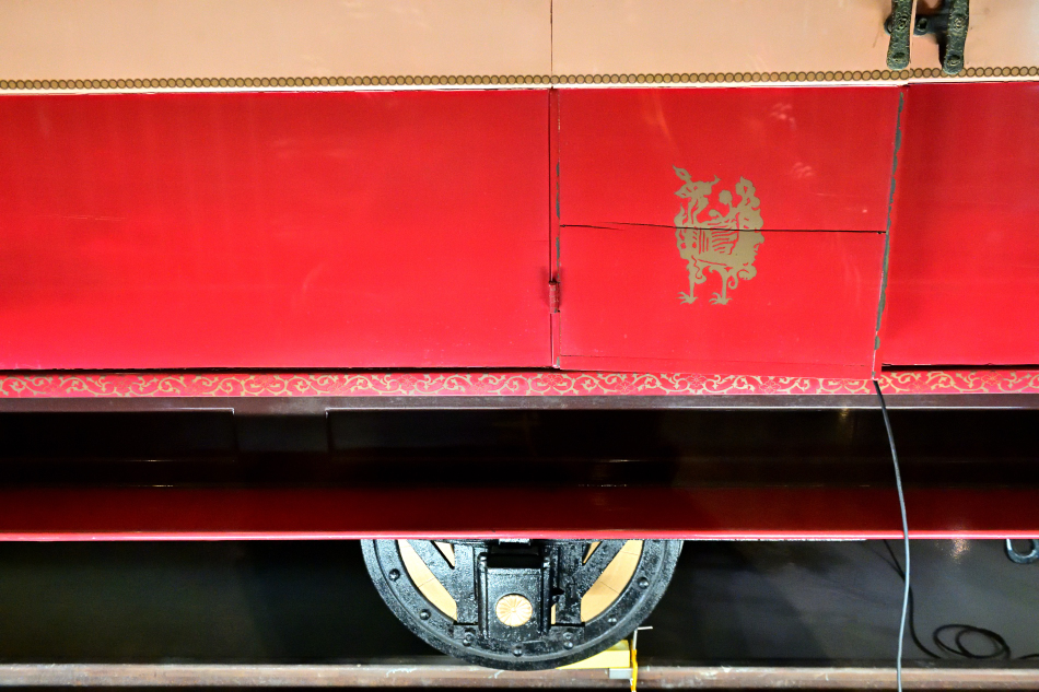 2軸車で,軸箱には菊の御紋章が入っています。車輪の輪心は木製。車体扉には鳳凰が描かれ台枠には唐草模様。 | ||||||||||||||||||||||||||||||||||||||||||||||||||||||||||||||||||||||||||||||||||||||||||||||||