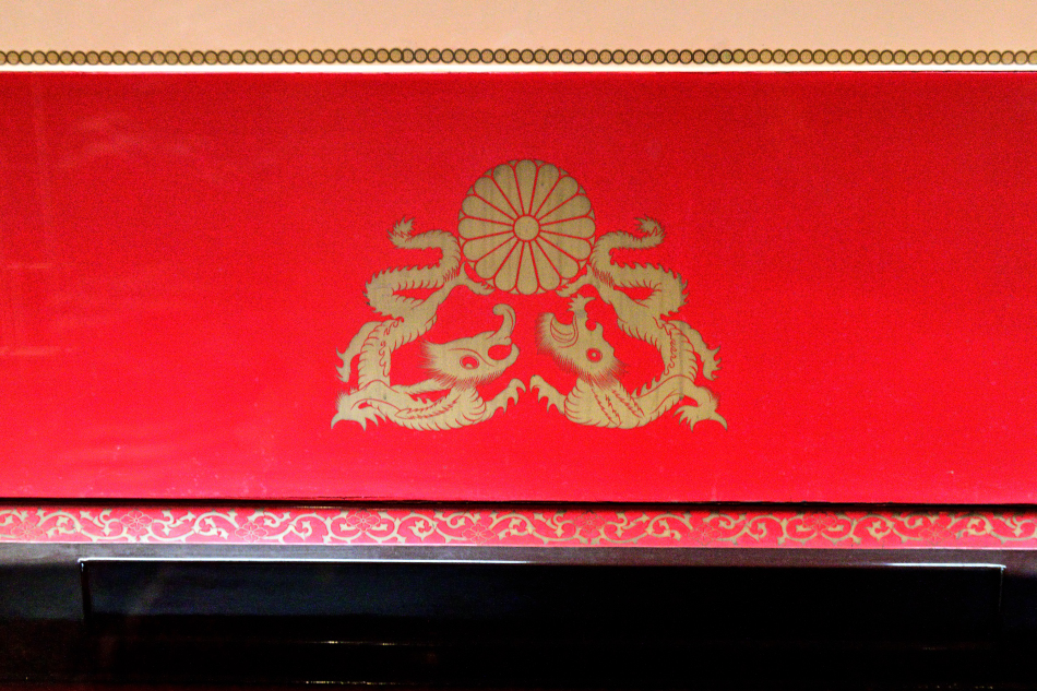 御座所の大きな窓の下中央に金粉で描かれた菊花御紋章とニ頭の龍の図 | ||||||||||||||||||||||||||||||||||||||||||||||||||||||||||||||||||||||||||||||||||||||||||||||||