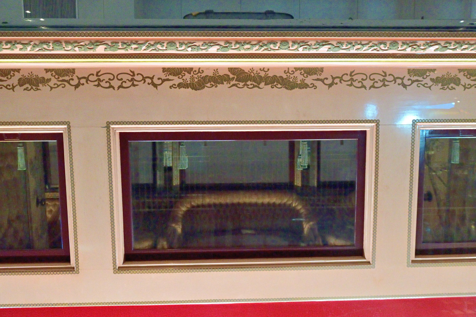 大正天皇・貞明皇后の7号御料車と比較して,金線による装飾は簡素になっています。左側の扉の隣が次室。 | ||||||||||||||||||||||||||||||||||||||||||||||||||||||||||||||||||||||||||||||||||||||||||||||||