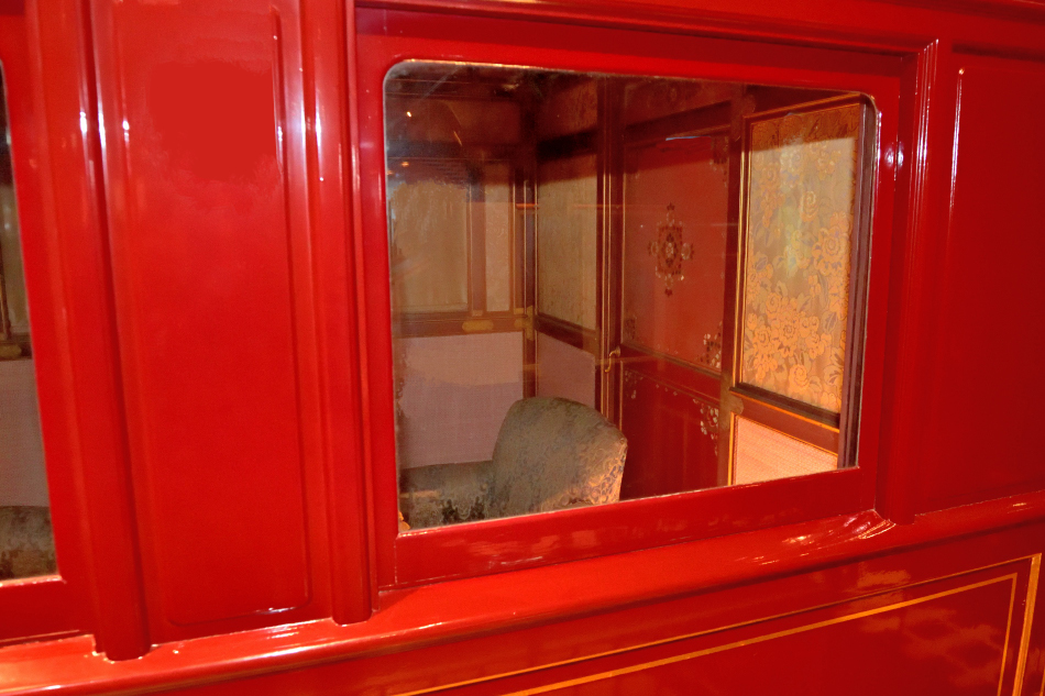 8号御料車は女官室部分のみが現存し鉄道博物館で一般公開されています。右側が御座所への扉。外板に塗られた深紅色の漆が鮮やかで,この色調の御料車が走行するところを見てみたいと思います。 | ||||||||||||||||||||||||||||||||||||||||||||||||||||||||||||||||||||||||||||||||||||||||||||||||