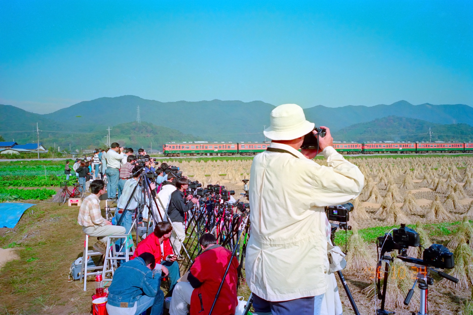 現場はこーんなかんじ。場所取りシートやロープは現場の掛け声で当日早朝に一斉に片付けられ,ゴミ拾いも徹底するなど緊張の中にも統制の取れた行動がされていました。農家の方も稲藁の天日干しに気合が入っていました。 (2004/10/17追加 2022/09/10再スキャン ワイド化) |