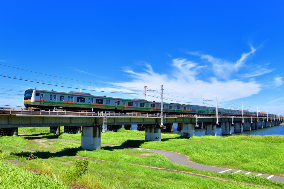 熱海 夏空の下,馬入川を渡る横コツ所属のE-08編成,後寄り5両は231系 (2025/07/22追加) |