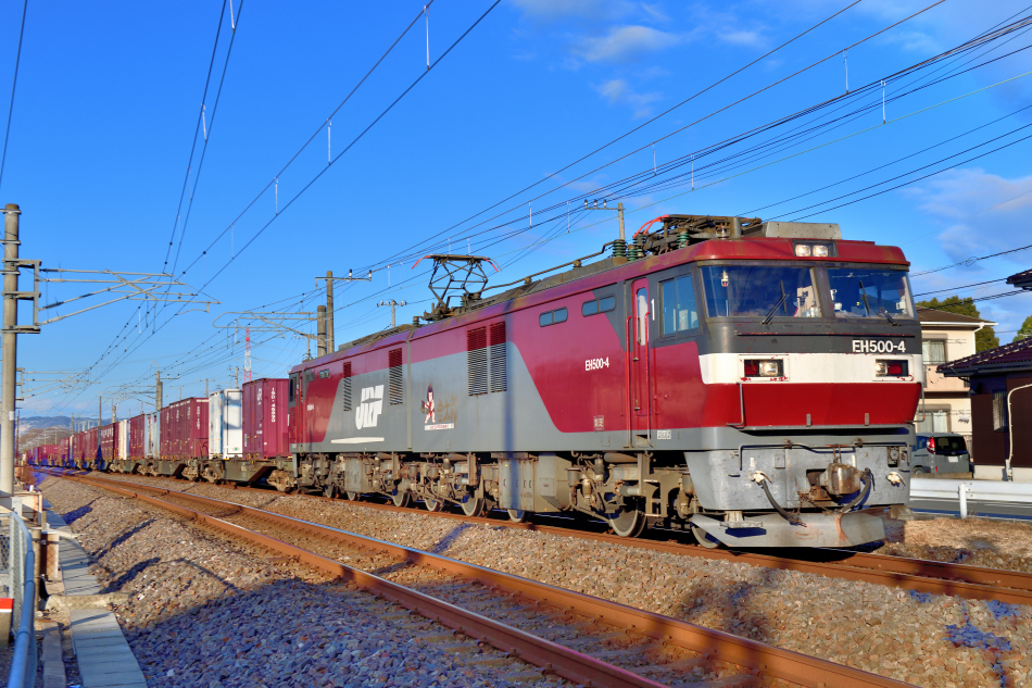 EH500 76号機牽引のコンテナ列車。上り下りとも本数が多くカメラ片手に踏切の周りを走り回って撮影していました。 (翌日追加 2023/03/10ワイド化) |
