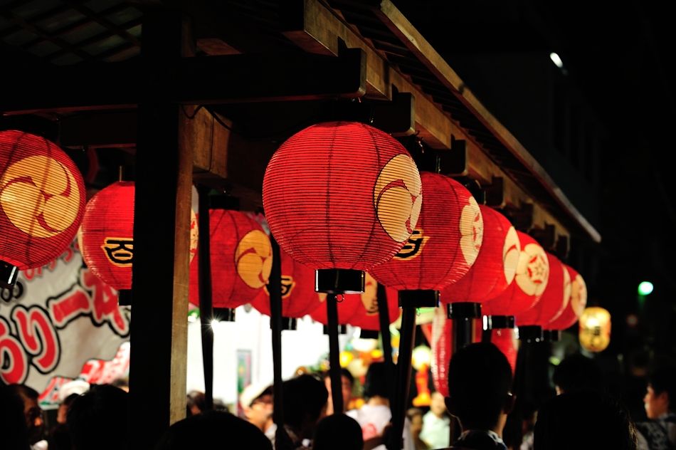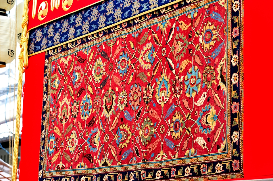 | 浴衣の似合う宵々山。前懸は近年復元新調された後懸「中東蓮花水辺に魚文様」ペルシャ絨毯を付けている。 |