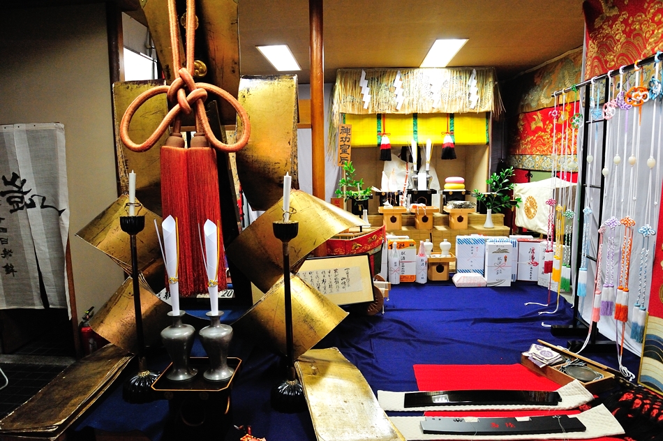 | 日和神楽用の台車を用いて囃子方も巡行。 |