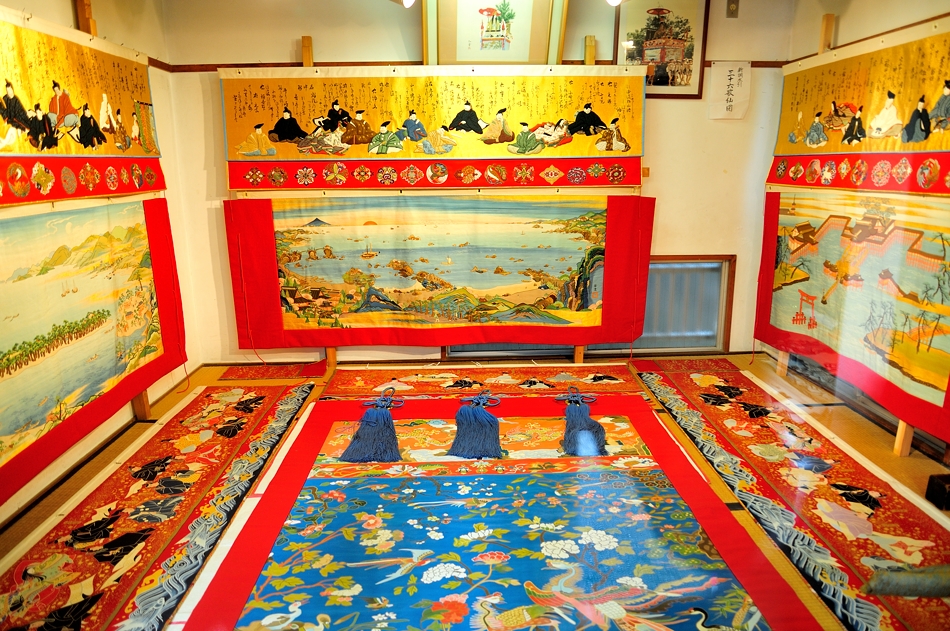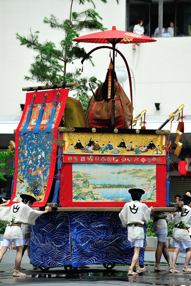 | 舁山は神輿と同様に舁いて巡行するのが本来の姿であるが,近年は負担軽減のため台車を付けている。見送は綴錦「双龍宝尽額牡丹鳳凰文図」 |