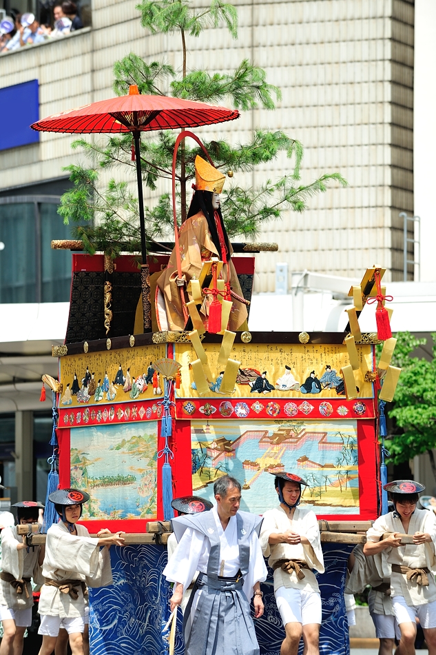 | 占出山は神功皇后が鮎を釣り戦勝の兆しを占った故事に由来し,神功皇后を祭神として祀っている。水引は平成二十五年(2013)に新調された「三十六歌仙」,前懸は「宮島」,左右の胴懸は「松島」と「天橋立」。 |