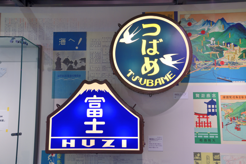 展望車のデッキに取り付けられた行灯式テールマーク。丸い「つばめ」「はと」の他,山型の富士マークもありました。富士のローマ字はHUZIと表記されています。ちなみに鉄道博物館のマイテ3911の富士はFUJIとなっています。 (2023/01/05追加 2026/01/07ワイド化) |