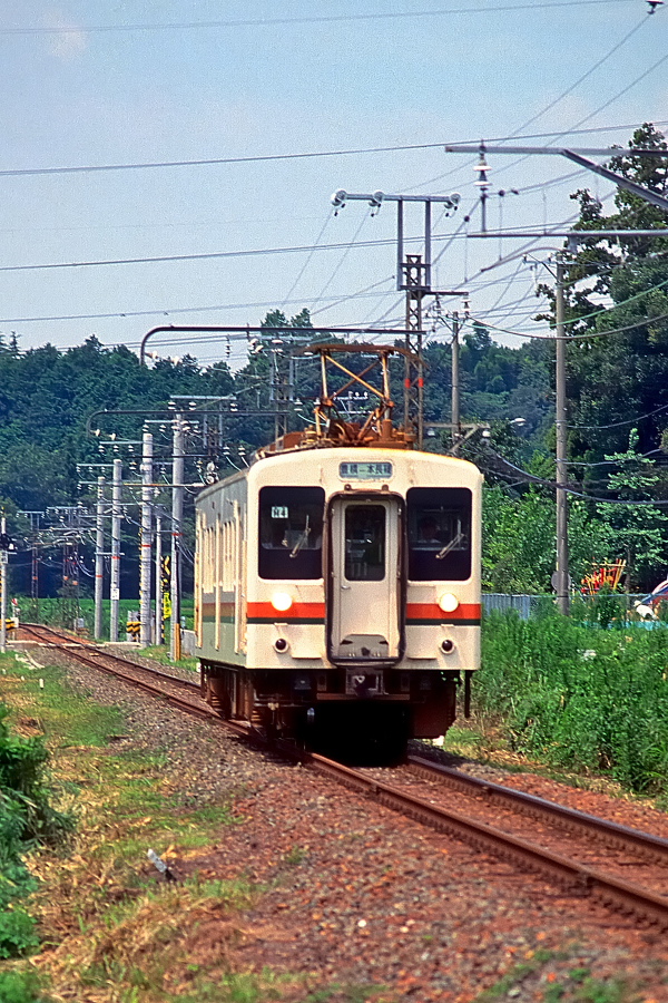 | No.225‐19 1991年7月25日 静シス M4編成 クモハ119‐5104 飯田線 江島→東上 クモハ119を単行運転できるように100番台化改造され,冷房装置を付けて5100番台になりました。JR東海色に塗り替えられています。写真は旧L4編成のクモハ119‐9で,1988年3月31日に両運転台化改造でクモハ119‐104となり,1990年2月21日に冷房化改造によりクモハ119‐5104に再度改番されています。 (2018/09/30追加 2023/04/29ワイド化) |
