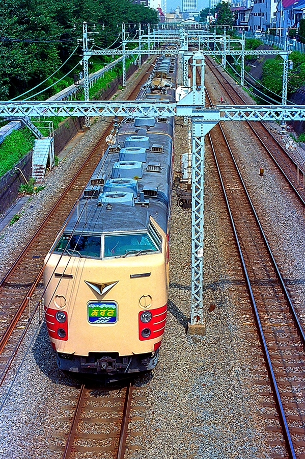 | No.N8801‐08 1988年8月 長モトM14編成 クハ183‐1013他 9両 あずさ 中央本線 中野←新宿 松本/奇 クハ183‐1013+モハ183‐1040+モハ182‐1040+サロ183‐1106+モハ183‐1046+モハ182‐1046+モハ183‐1050+モハ183‐1050+クハ183‐1002 新宿 中央本線の複々線区間をゆくあずさ。 (2016/12/12追加) |