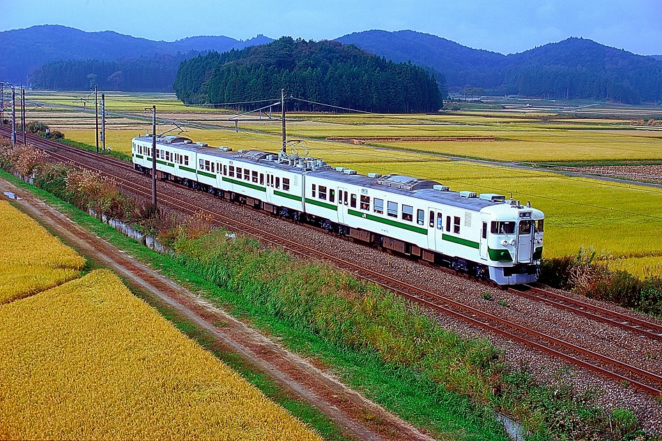 実りの季節を迎え金色に染まる東北本線・久田野の田園地帯を快走する417系。717系と似ていますが,新製の417系は全車集中形クーラー,急行形改造の717系は先頭車に種車の分散形クーラーを積んでいるので容易に区別できます。 | |||||||||||||||||||||