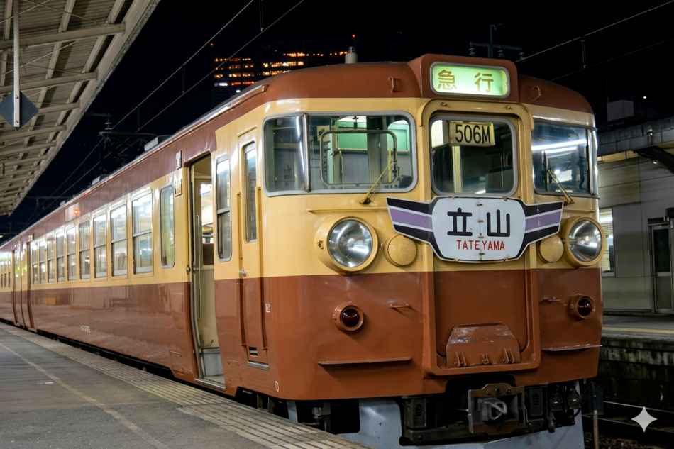 大阪 大阪駅11番線で出発を待つ急行立山3号。立山3号(下り)は1-9号車が大阪-糸魚川行きで富山-糸魚川間は季節運転でした。当日のデッキ部の写真を見ると4号車のサボは糸魚川-大阪になっていました。この写真は画質が荒くボツにしていたコマですが生成AIでノイズ除去しました。所々AIが創作している点があるので参考程度にご覧ください。 (2026/03/24追加) |